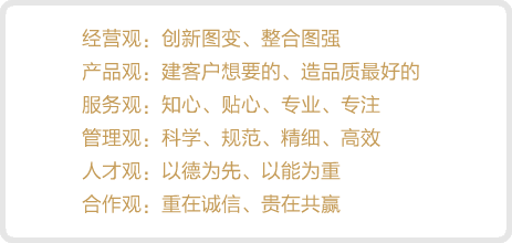 引領(lǐng)人居進(jìn)程:為不斷改善和提升民眾居住質(zhì)量,我們將始終如一、不遺余力的努力探索和用心創(chuàng)造適合居住的生活新模式,成為新生活的倡導(dǎo)者和規(guī)劃者、引領(lǐng)人們的生活真正進(jìn)入一個(gè)詩(shī)意人居的理想境界。