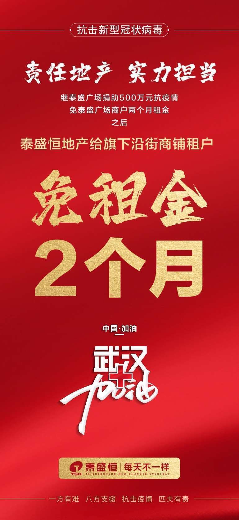 疫情之下,千家萬戶閉門不出,昔日繁華的街道寂靜清冷,商戶門頭門窗緊閉,經(jīng)濟(jì)自然受到較大影響。尤其對經(jīng)營生意的老板而言,壓力陡增,苦不堪言。此番困境,泰盛恒地產(chǎn)看在眼里,并及時調(diào)整營銷策略。經(jīng)過公司研究決定,明確了“以關(guān)懷業(yè)主、商戶生存為重”的出發(fā)點(diǎn),決定免除泰盛恒地產(chǎn)旗下沿街商鋪?zhàn)鈶?/span>2個月租金。此舉一出便獲得了眾多商戶的點(diǎn)贊和支持。一解燃眉之急,商戶們更加堅(jiān)定了與泰盛恒地產(chǎn)攜手前行的信心。